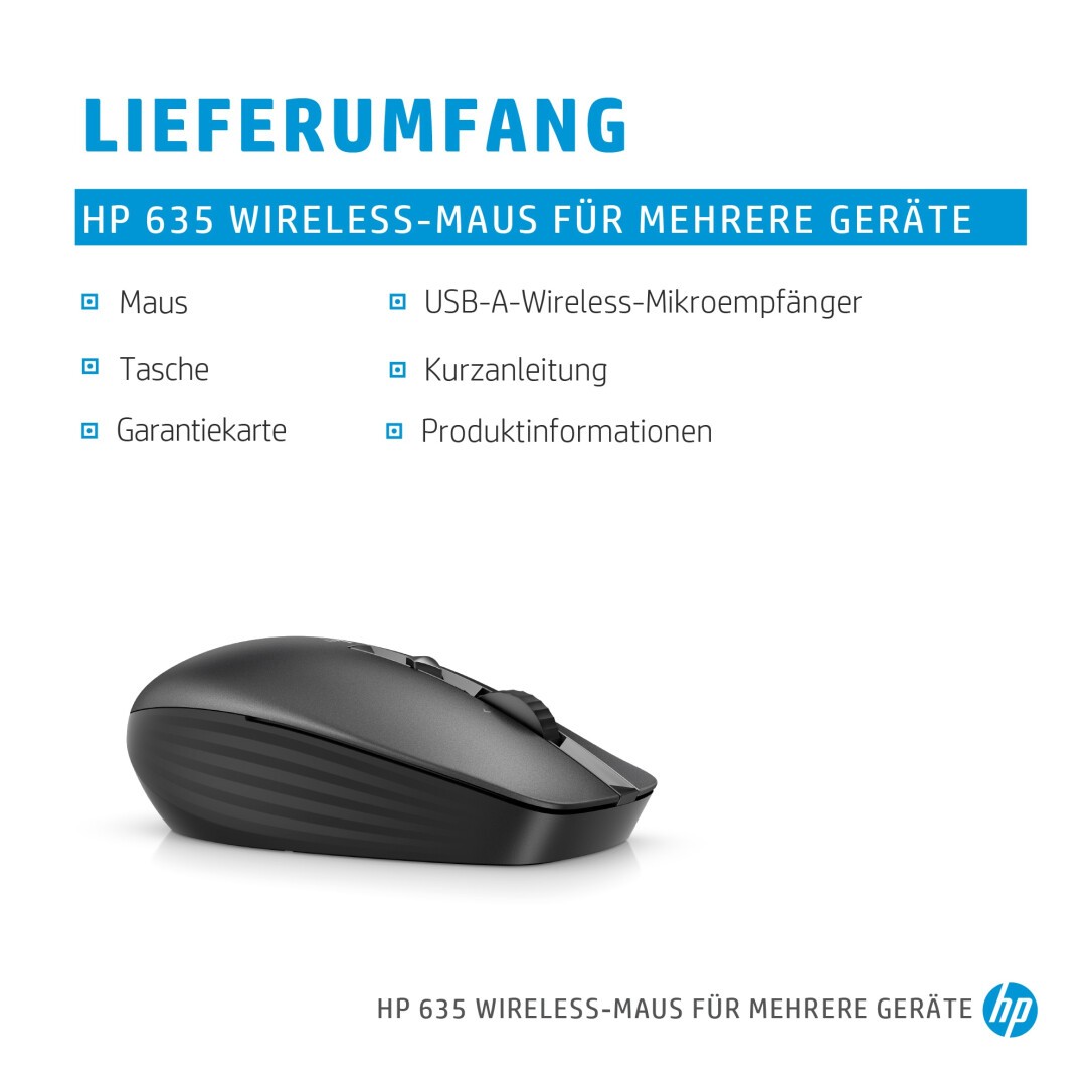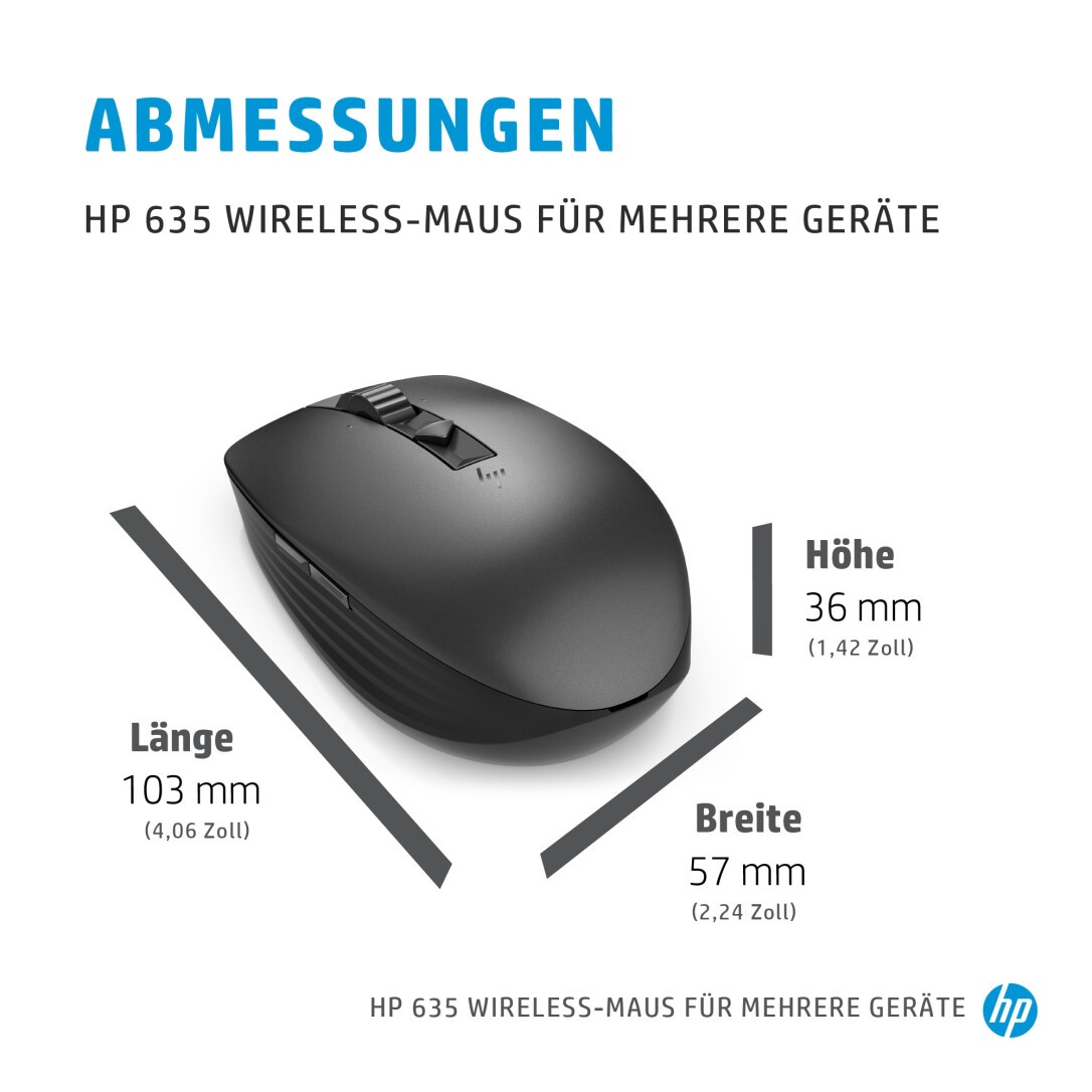 HP 635 Wireless-Maus für mehrere Geräte. Formfaktor: Beidhändig. Geräteschnittstelle: RF Wireless + Bluetooth, Bewegung Auflösung: 1200 DPI, Tastentyp: Gedrückte Tasten, Knopfanzahl: 4, Scroll Typ: Rad. Energiequelle: Batterien. arbeitet auf jeder Oberfläche. Produktfarbe: Schwarz
