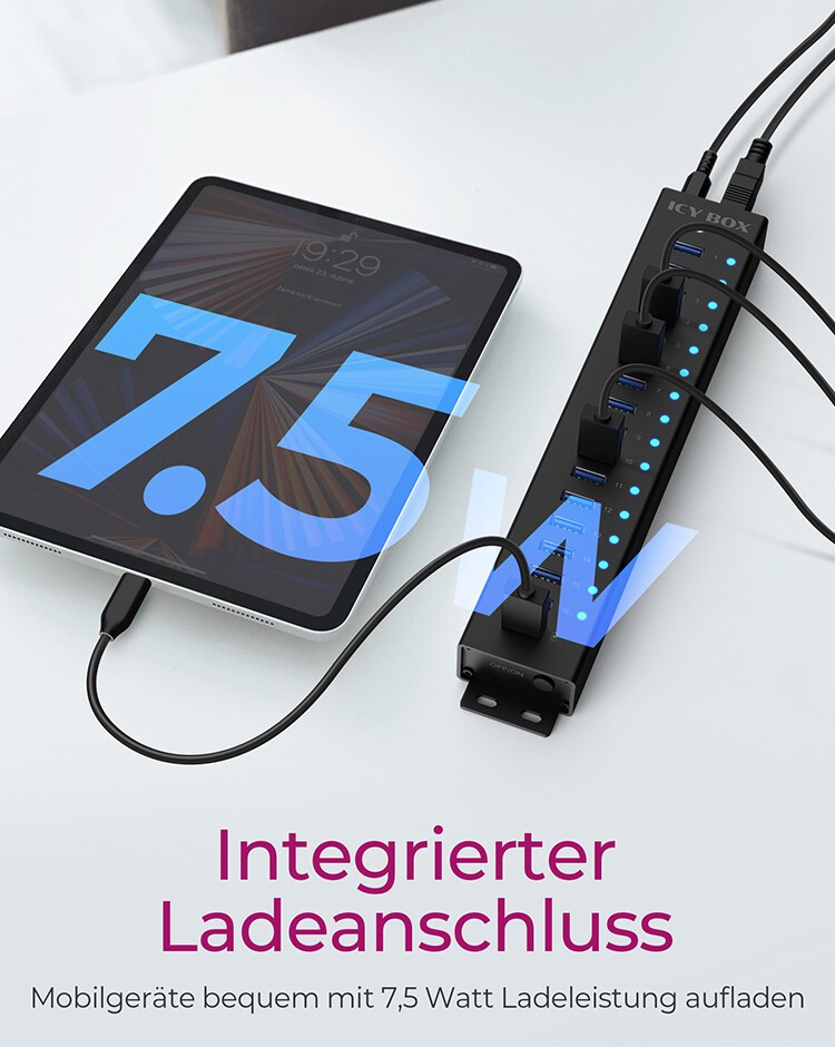 - Der IB-HUB1717-U3 verfügt über einen dezidierten USB-Ladeanschluss, über den sich Mobilgeräte mit bis zu 7,5 W Ladeleistung aufladen lassen