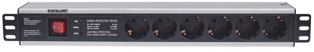 Intellinet 19" 6-fach Steckdosenleiste, Schutzkontakt, Überspannungsschutz, Netzschalter, 3 m Stromkabel, 1,5 HE. Rack-Kapazität: 1.5U, Typ: Stromverteiler, Gehäusematerial: Aluminium. Anzahl der AC-Ausgänge: 6 AC-Ausgänge. Kabellänge: 3 m. Stromstärke (maximal): 16 A. Breite: 44,4 mm, Tiefe: 482,6 mm, Höhe: 62 mm