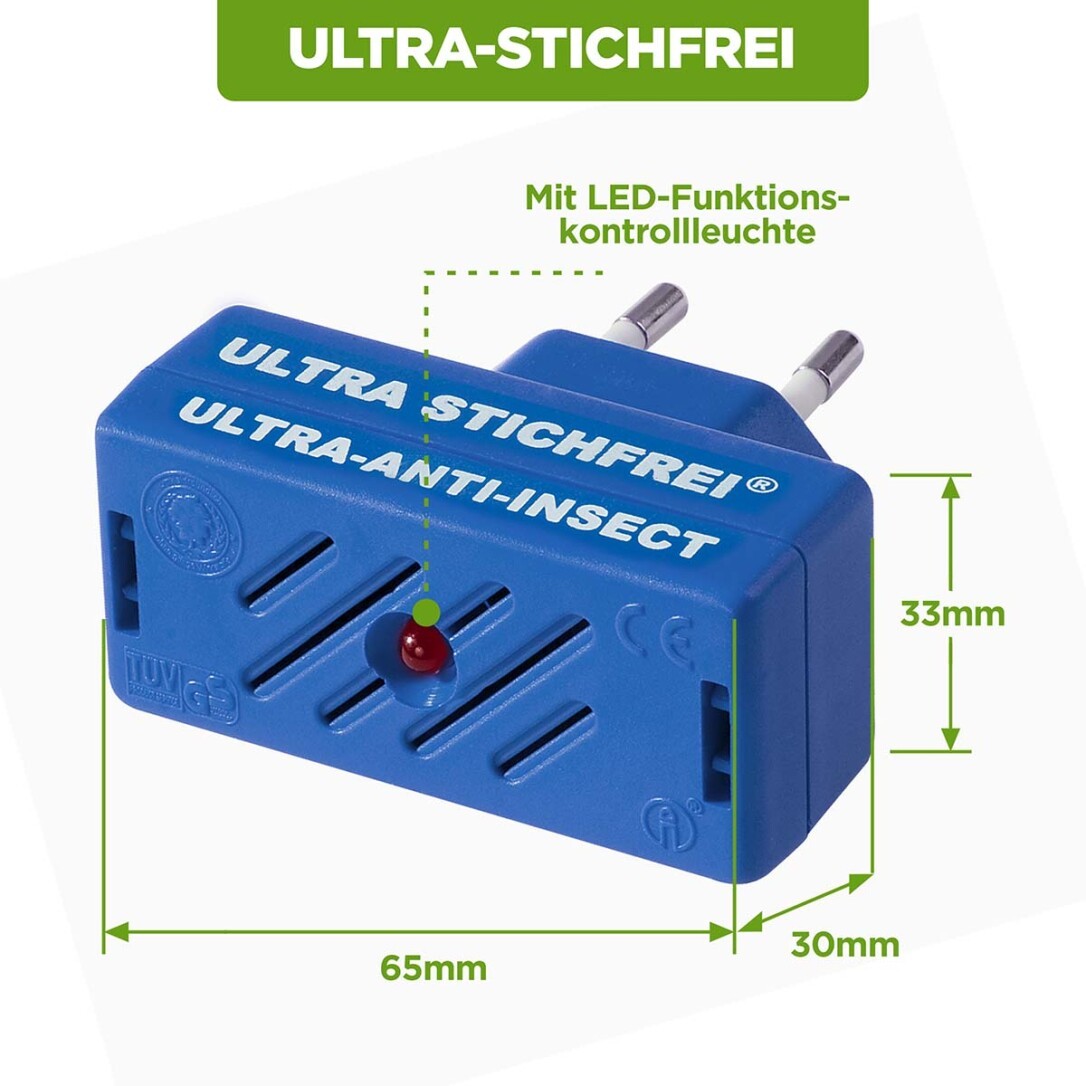 ULTRA BITE-FREE sendet einen ultrahohen Ton, der für das menschliche Ohr kaum wahrnehmbar ist und weibliche und befruchtete Insekten vertreibt.