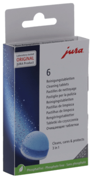 Reinigungstabletten, für gleichbleibend perfekte Kaffeequalität ist die optimale Pflege Ihres Vollautomaten und der hygienische Umgang mit Milch, Kaffee und Wasser entscheidend. Zur unkomplizierten Pflege verfügt jeder Vollautomat von JURA über eine wartungsfreie Brüheinheit, die sich auf Knopfdruck selbst reinigt. Die millionenfach bewährten Original-Reinigungstabletten von JURA werden von unserem Laborteam konstant optimiert und weiterentwickelt. Die neue 3-Phasen-Reinigungstablette als innovatives Resultat intensiver Forschung bietet jetzt noch bessere Ergebnisse durch eine zusätzliche Schutzphase, die Ihren Vollautomaten nachhaltig vor Ablagerungen durch Mineralien schützt. Die Anwendung ist dabei unverändert einfach.