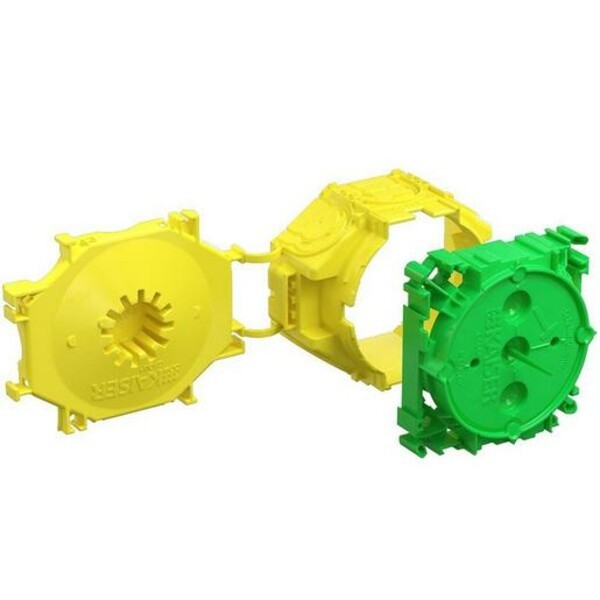 Gerätedose mit 4 Schraubdomen und 2 Spreizkrallenfeldern. 2-teilig mit angespritztem Rückteil, 2 Aufnahmen für B1 Prefix-Systemflügel. Dosen-Rückteil mit Aufnahme für Stützelement, für alle Schalungsarten geeignet. Einbauöffnung Ø 60 mm, Norm-Kombinationsabstand 71 mm. Länge x Breite x Tiefe 94 x 75 x 59 mm.