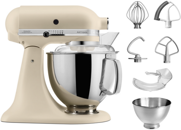 KitchenAid Artisan. Schüsselkapazität: 4,8 l, Produktfarbe: Beige, Steuerung: Leiter. Schüsselmaterial: Edelstahl, Gehäusematerial: Zink. Leistung: 300 W, AC Eingangsspannung: 220 - 240 V, AC Eingangsfrequenz: 50 - 60 Hz. Breite: 240 mm, Tiefe: 370 mm, Höhe: 360 mm. Verpackungsbreite: 406 mm, Verpackungstiefe: 273 mm, Verpackungshöhe: 413 mm