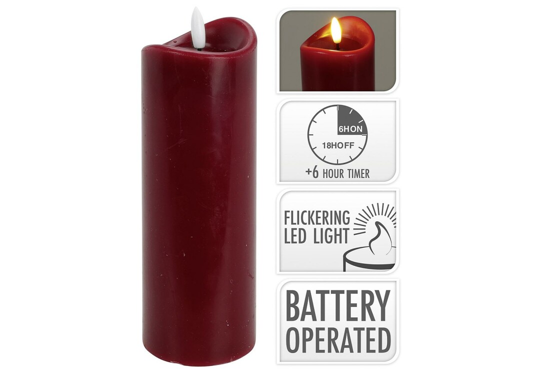 LED Kerze mit Echtwachseffekt, eingebauter Timer 6 Std. an / 18 Std. aus, 0,03 W, 3 V DC, Batterie 2 x AA (nicht enthalten), IP 20, 20 x 7 cm, dunkelrot