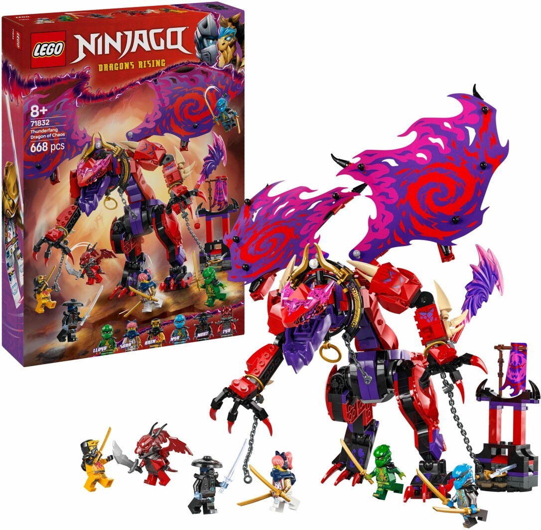 LEGO NINJAGO Chaosdrache Donnerzahn (71832) ist ein fantasievolles Spielset, mit dem Jungen und Mädchen ab 8 Jahren spannende Actionszenen aus der 3. Staffel der TV-Serie NINJAGO Aufstieg der Drachen nachstellen können. Dieses Bauset für Kinder beinhaltet einen großen Spielzeug Drachen, der Schwanz, Kopf und Maul sowie Füße, Beine und Flügel bewegen kann. Außerdem trägt er einen Shooter unter jedem Flügel. Die Drachenfigur ist an ein kleines Nebenmodell gekettet. Mit den beiden Prismaklingen kann man ihn von den Ketten befreien. Das LEGO Bauspielzeug beinhaltet 6 NINJAGO Minifiguren: Die Ninja-Helden Lloyd, Nya, Arin und Sora tragen Ninja-Ausrüstung, und die beiden Bösewichte – Nokt und der Anführer der Drachenmenschen namens Tyr – sind ebenfalls bestens für spannende Duelle zwischen Gut und Böse ausgerüstet. In dem breiten Angebot an separat erhältlichen LEGO NINJAGO Bausets und baubaren Spielzeugen finden Ninja-Fans viele Mechs, Drachen und Tempel für spannende Gefechte zwischen Gut und Böse. Jedes dieser Ninja Modelle kann auch mithilfe der LEGO Builder App gebaut werden, die dich und dein Kind auf ein ebenso einfaches wie intuitives Bauabenteuer mitnimmt. Der Chaosdrache Donnerzahn ist 24 cm groß. Enthält 668 Teile.