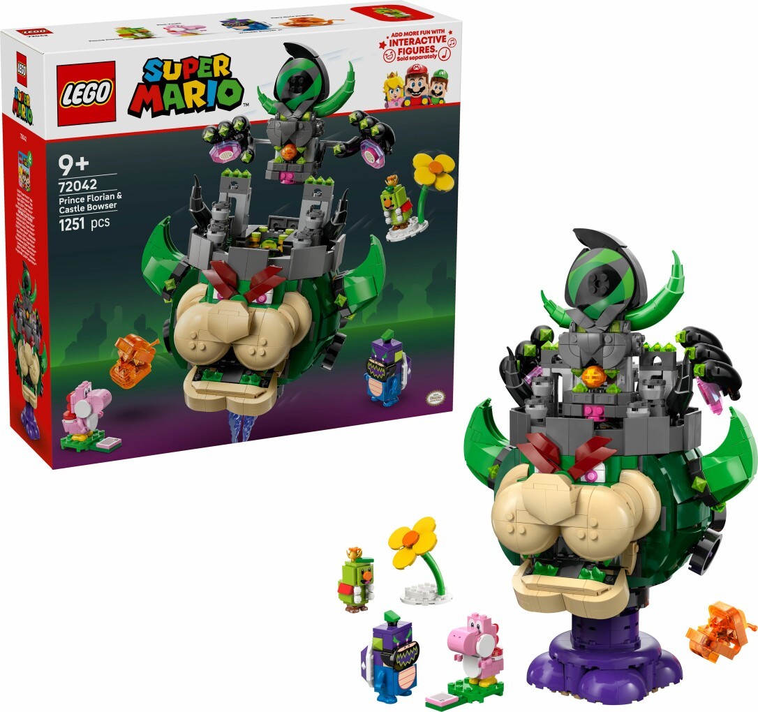 Dieses LEGO Super Mario Spielset (72042) ist ein spannendes Geschenk für Mädchen und Jungen ab 9 Jahren. Mit Schloss-Bowser, rosa Yoshi, Wunder-Bowser Jr., Prinz Florian und der Piranha-Feuernote können Kinder aufregende Szenen aus Super Mario Bros. Wonder nachspielen. Das Nintendo LEGO Set begeistert nicht nur beim Spielen, sondern ist auch ein beeindruckendes Ausstellungsstück im Kinderzimmer. Das Spielschloss lässt sich vom Ständer heben, um das detailreiche Innere zu entdecken - inklusive Zelle für Prinz Florian. Kinder können das komplette Schloss oder nur den oberen Teil ''fliegen lassen und dabei einen Feuerball aus dem Maul abfeuern. In Kombination mit LEGO Mario, Luigi oder Peach (separat erhältlich) wird der Endkampf mit echten Effekten zum interaktiven Spielerlebnis. Mit 1.251 Teilen bietet dieses umfangreiche Set kreativen Spielspaß und ist ein tolles Mitbringsel für Kinder, die LEGO Super Mario lieben. Das Spielset mit LEGO Piranha Pflanze, Prinz und Schloss sorgt für epische Abenteuer in der Welt von Super Mario. Weitere passende LEGO Super Mario Sets sind separat erhältlich. Das Modell des Schloss-Bowsers aus diesem Spielset ist 31 cm hoch, 21 cm breit und 22 cm tief. Enthält 1251 Teile