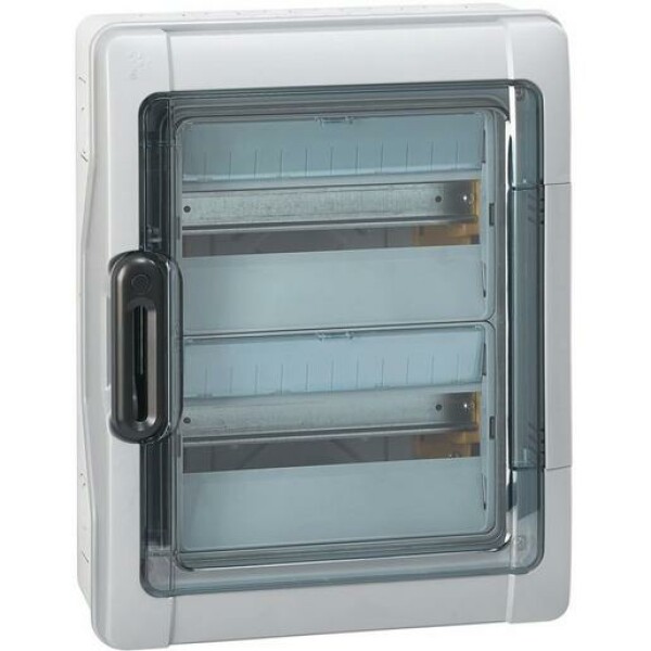 Feuchtraumverteiler Plexo³, Schutzart IP65 - IK09, 2-reihig, 24 Module (12 Module/Reihe), Abmessung 432 x 340 x 161 (Höhe x Breite x Tiefe in mm), selbstverlöschend 650 °C, inklusive N- und PE-Klemmen, Aufputzverteiler Schutzklasse II. Türen transparent, beidseitig anschlagbar. Nach EN 62208, für den Bau von Installationsverteilern nach EN 61439-3.