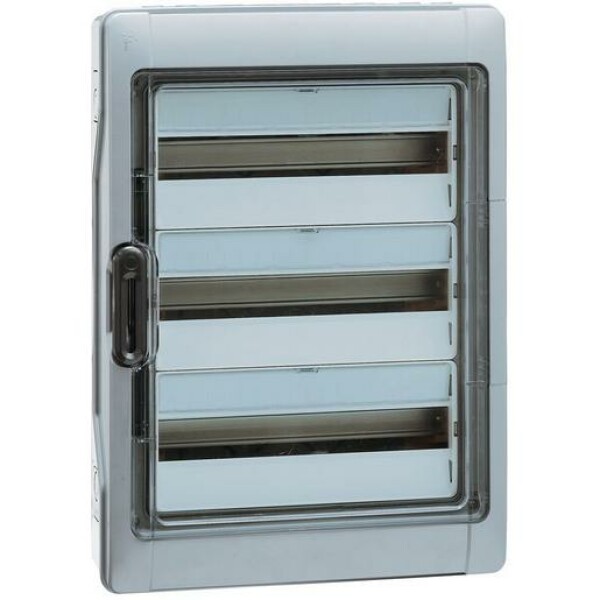 Feuchtraumverteiler Plexo³, Schutzart IP65 - IK09, 3-reihig, 36 Module (12 Module/Reihe), Abmessung 622 x 340 x 161 (Höhe x Breite x Tiefe in mm), selbstverlöschend 650 °C, inklusive N- und PE-Klemmen, Aufputzverteiler Schutzklasse II. Türen transparent, beidseitig anschlagbar. Nach EN 62208, für den Bau von Installationsverteilern nach EN 61439-3.