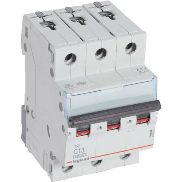 Leitungsschutzschalter TX3 nach EN 60898-1, VDE 0641-11, EN 60947-2, 3-polig, C-Charakteristik, Bemessungsstrom In 13 A, Bemessungsschaltvermögen Icn 10 kA nach EN 60898-1, Bemessungsspannung Un 400 VAC, Bemessungsfrequenz 50/60 Hz, Energiebegrenzungsklasse 3, Befestigung auf Hutprofilschiene EN 60715 durch eine rastende Schnellbefestigung, klare Information vorne auf jedem Gerät, eindeutige Schaltstellungsanzeige rot/grün am Schalthebel, mit Beschriftungsfenster, mit Untersteckschutz zum sicheren Einführen des Leiters in Fahrstuhlklemme, Anbau von Hilfsgeräten möglich. Leitungsschutzschalter mit C-Charakteristik sind für den Leitungsschutz bei Geräten mit hohen Einschaltströmen (z.B. Motoren und Transformatoren) vorgesehen.