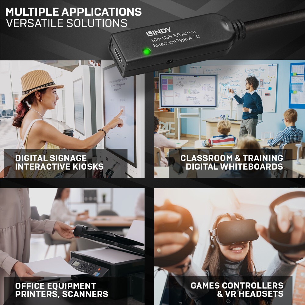 Lindy 10m USB 3.0 Aktivverlängerung Typ A an C, 10 m, USB A, USB C, USB 3.2 Gen 1 (3.1 Gen 1), 5 Gbit/s, Schwarz
