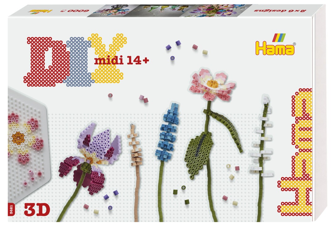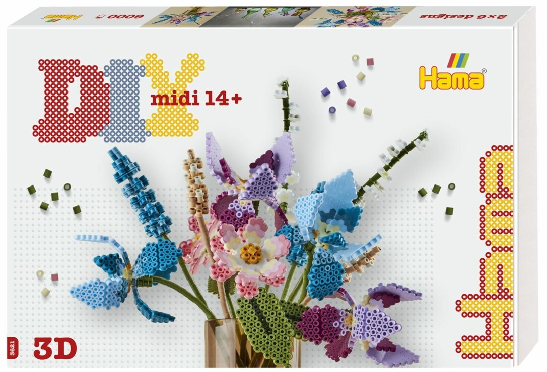 Geschenk Set mit ca. 6.000 bunten Hama Bügelperlen in verschiedenen Farben, Motivvorlage für einen Blumenstrauß mit 3D Blüten, drei Steckplatten, Bügelpapier und Anleitung