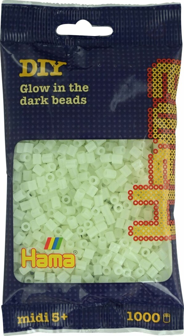 Beutel mit 1000 HAMA-Perlen in der Farbe Leuchtgrün (leuchten im Dunklen nach ca. 15 Minuten danach müssen diese wieder aufgeladen werden). Ab 5 Jahren.