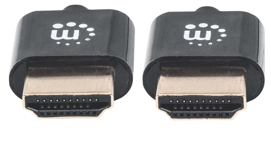 Manhattan Ultradünnes High Speed HDMI-Kabel mit Ethernet-Kanal, HEC, ARC, 3D, 4K, HDMI-Stecker auf HDMI-Stecker, geschirmt, schwarz, 1 m. Kabellänge: 1 m, Anschluss 1: HDMI Typ A (Standard), Steckverbinder 1 Geschlecht: Männlich, Anschluss 2: HDMI Typ A (Standard), Steckverbinder 2 Geschlecht: Männlich, Beschichtung Steckerkontakte: Gold, 3D, Datenübertragungsrate: 18 Gbit/s, Audio Return Channel (ARC), Produktfarbe: Schwarz