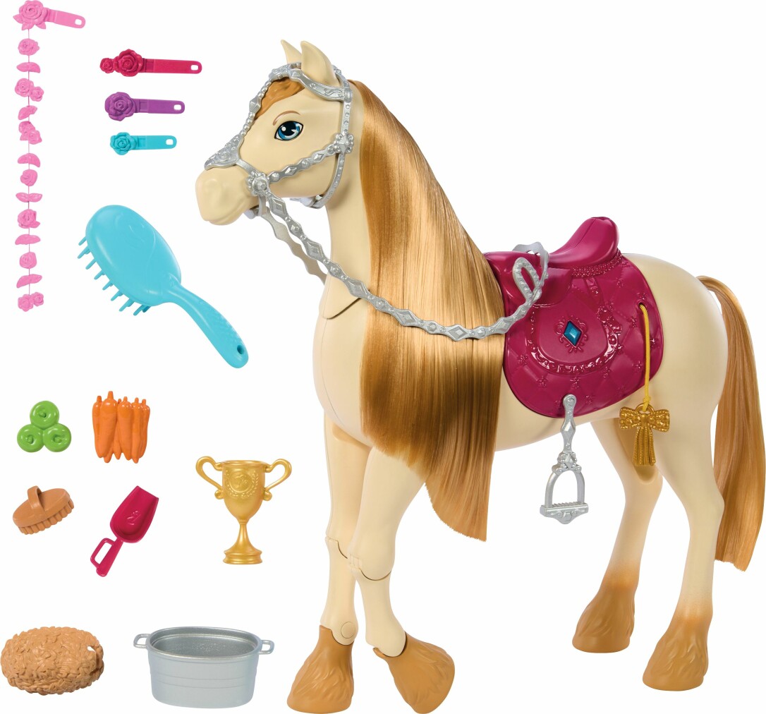 Tornado galoppiert aus der Netflix-Serie Barbie Mysteries: Das geheimnisvolle Pferdeabenteuer als interaktives Spielzeugpferd mit über 20 Geräuschen und vielen Spielmöglichkeiten von der Pflege über die Darbietung bis hin zum Frisieren ins Spiel. Dieses Barbie-Pferd tanzt, blinzelt mit den Augen, spielt von der Show inspirierte Lieder und macht lustige Geräusche wie Wiehern, Kauen, Galoppieren und mehr. Zubehörteile wie eine Trophäe, Futter, eine Bürste und ein Futterbehälter lassen der Fantasie mit Barbie und ihrem neuen Pferdefreund Tornado freien Lauf! Abweichungen in Farbe und Gestaltung vorbehalten.