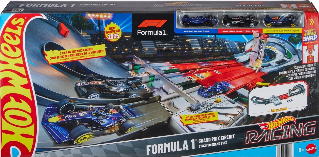 Kinder können mit diesem Trackset von Hot Wheels den spannenden Autorennspaß von Formel 1® Grand Prix-Rennstrecken nachspielen. Im Rennmodus verfolgt der Rundenzähler die Autos dabei, wie sie durch den dreispurigen Beschleuniger brettern und um dynamische Kurven und über Erhöhungen rasen wie auf echten Straßen der Stadt. Wenn Kinder den interaktiven DRS Spurenwechsler aktivieren, können die Fahrzeuge das führende Fahrzeug in Kurven überholen. Wer zuerst am Zieltor ankommt, hat gewonnen. Im unendlichen Modus können wiederholt Wettrennen gegen die drei enthaltenen F1® Die-Cast-Autos gefahren werden, wobei Kinder den Spurenwechsler manuell anpassen können, um den Wettkampf zu steigern. Die Tracks können mithilfe der enthaltenen Track-Schnellstecksystem-Verbindungspunkte mit weiteren Tracks und Sets verbunden werden, um die Rennstrecke zu erweitern. (Zusätzliche Hot Wheels Tracks und Sets sind separat erhältlich.) Abweichungen in Farbe und Gestaltung vorbehalten.