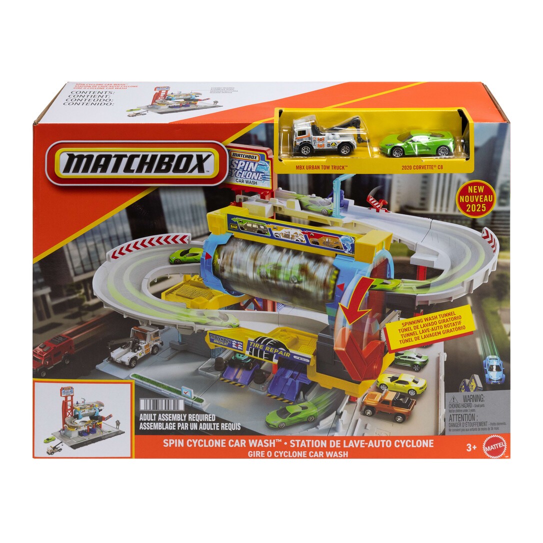 Mit der rotierenden Waschstraße von Matchbox können Kinder ihrer Abenteuerlust in einem Spielset mit verschiedenen Ebenen freien Lauf lassen und kreativ werden. In der Tuning-Station werden die Autos auf einer funktionierenden Fahrzeughebebühne renntauglich gemacht, Reifen gewechselt und perfekt ausgerichtet! Auf der oberen Ebene sorgt ein beweglicher Aufseher für einen reibungslosen Verkehrsfluss und lenkt die Autos zu der rotierenden Waschstraße. Kinder ziehen an einem Griff, damit sich der Tunnel dreht und nach dem Zufallsprinzip auf einer von drei Einstellungsmöglichkeiten stehen bleibt: schmutzig, eingeseift oder sauber. Wenn er auf dem Symbol für Sauber landet, fährt das Auto auf die untere Ebene. Das Set enthält ein Corvette-Spielzeugauto und einen Abschleppwagen im Maßstab 1:64, um die Möglichkeiten zum Geschichtenerzählen zu erweitern. Abweichungen in Farbe und Gestaltung vorbehalten.