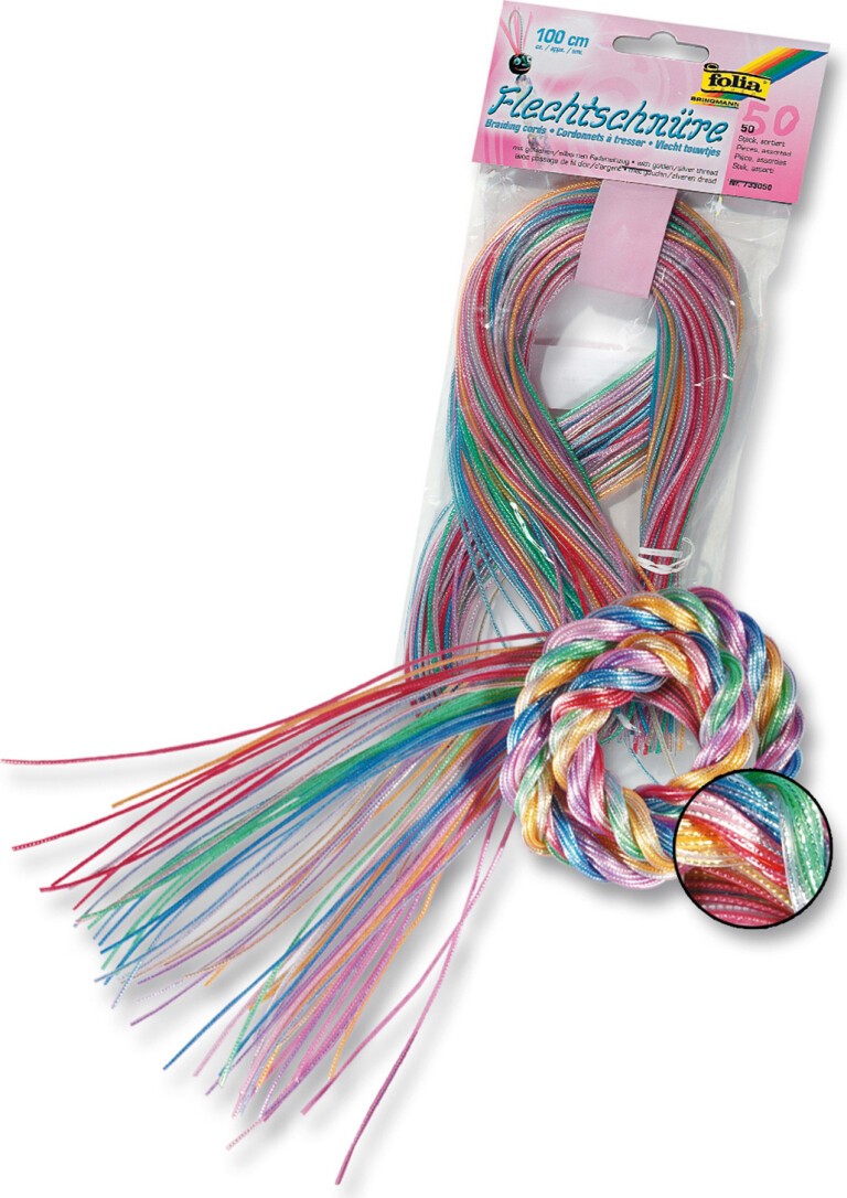 Sie erhalten 50 bunte Flechtschnüre sortiert in 10 gängigen Farben. Diese sind transparent und haben einen goldenen bzw. silbernen Fadeneinzug. Sie sind ca. 1,8 mm stark und 100 cm lang. Bestens geeignet zum Flechten von Freundschaftsbändern, Schlüsselanhängern uvm. Warnhinweise Bitte lesen Sie vor Gebrauch der Spielwaren ausführlich die Bedienungsanleitung.