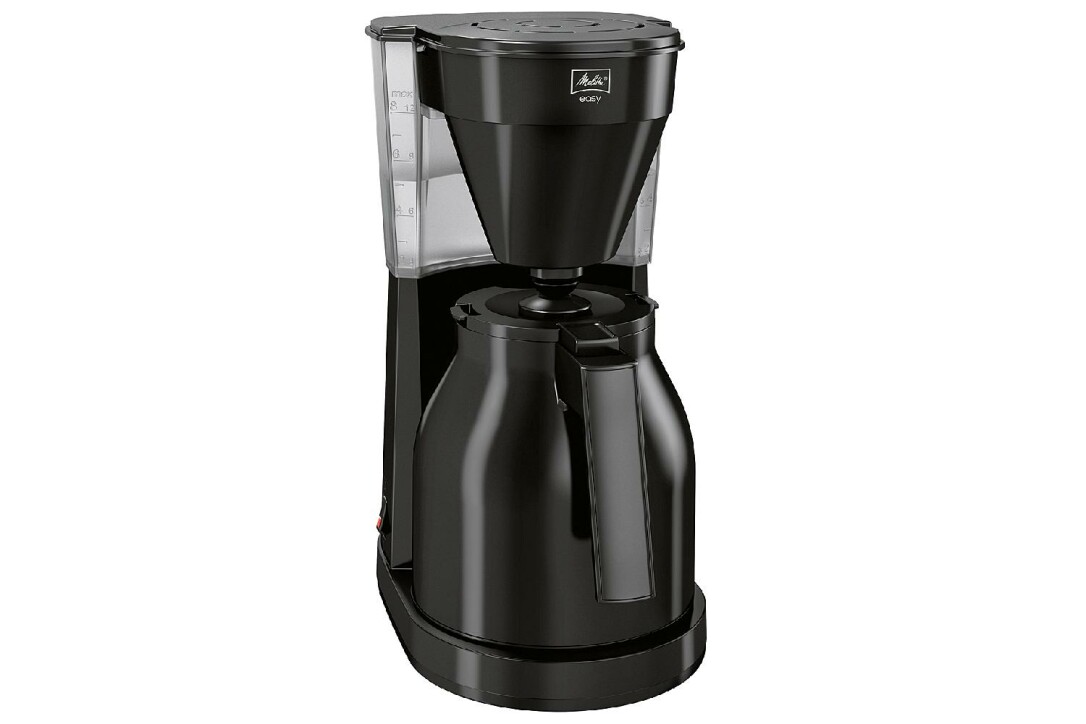 Melitta - Die renommierte Marke für Kaffeegenuss Thermokanne - Hält bis zu 8 Tassen Kaffee lange heiß und frisch Filterkaffeemaschine - Aromatischer Kaffeegenuss für Zuhause Tropfstopp - Sauberes Eingießen ohne lästiges Tropfen Schwarz - Zeitloses Design für jede KücheDie Melitta 1023-06 Easy II Therm Filterkaffeemaschine bietet Ihnen die perfekte Lösung für aromatischen Filterkaffee in kleinen Mengen. Mit der Thermkanne bleiben bis zu 8 Tassen Kaffee lange heiß und frisch. Der Schwenkfiltereinsatz ermöglicht eine unkomplizierte Handhabung und der abnehmbare Filtereinsatz ist leicht zu reinigen. Die externe Wasserstandsanzeige auf beiden Seiten des Wassertanks erleichtert das Befüllen, während der Tropfstopp ein sauberes Eingießen ohne Tropfen ermöglicht.Weitere Funktionen wie der beleuchtete Ein-/Ausschalter und die automatische Endabschaltung sorgen für eine komfortable Nutzung. Außerdem sind die abnehmbaren Teile spülmaschinenfest, was die Reinigung der Kaffeemaschine noch unkomplizierter macht. Technische Daten:Fassungsvermögen: 8 Tassen Thermkanne Beleuchteter Ein-/Ausschalter Automatische EndabschaltungUnkomplizierte Reinigung: Die kleine Kaffeemaschine verfügt über eine Kabel-Aufwickelvorrichtung sowie einen abnehmbaren und spülmaschinengeeigneten Schwenkfilter. Integrierter Tropfstopp: Durch den Schließmechanismus beim Entnehmen der Thermkanne werden lästiges Nachtropfen und unschöne Kaffeeflecken vermieden. Skalierter Wassertank: Die Melitta Kaffeemaschine verfügt über einen transparenten Wassertank mit doppelter Tassenskala, die Du ganz leicht von vorne ablesen kannst. Schicke Thermkanne: Die Thermkanne hält den Kaffee zuverlässig warm und ist dank 'Easy Click'-Feature einfach zu öffnen – für unkomplizierten Kaffeegenuss. Einfach & zuverlässig: Beim Brühen läuft der Kaffee servierfertig in die Kaffeekanne und dank automatischer Abschaltung kannst Du Deinen Filterkaffee ganz entspannt genießen.Produktdetails:Kaffeemaschinen-Typ: Filterkaffeemaschine Fassungsvermögen: 8 Tassen Farbe: Schwarz Abmessungen: 23,8 x 17,3 x 35 cm Gewicht: 998 g