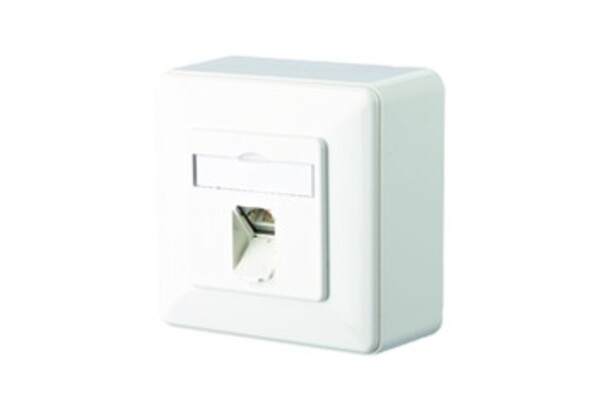 Aufputz-Anschlusseinheit mit einer oder zwei 8-poligen RJ45-Buchsen, Cat.6A Komponentenprüfung nach ISO/IEC 11801 Ed.2.2:2011-06, DIN EN 50173-1:2011-09, TIA/EIA-568-C.2 (2009-08) und IEC 60603-7-51 Ed.1 (12/2008), GHMT zertifiziert, Einhaltung der Klasse EA bis 500 MHz nach ISO/IEC 11801 Ed.2.2:2011-06, DIN EN 50173-1:2011-09, getestet: Komponente bis 600 MHz, Link bis 800 MHz, für 10GBit Ethernet (IEEE 802.3an), Remote Powering (PoE, PoE plus und UPoE) und HDBaseT geeignet, HF-technisch optimierte und ergonomisch geformte LSA-Anschlussklemme, Verschraubung der Klappe für Zugentlastung und Schirmabnahme erfolgt von vorne, Anschluss von Datenleitungen AWG26/1 - 22/1 (eindrahtig), Steckrichtung 45° nach unten geneigt, Mit Sichtfenster für beiliegende Beschriftungseinlage, Beschriftungsbogen 209 x 294 mm siehe Zubehör, Integrierte Staubschutzklappen (auch farbig erhältlich), Abdeckteile reinweiß RAL 9010 oder perlweiß RAL 1013, Varianten: 1 Port reinweiß, 1 Port perlweiß, 2 Port reinweiß, 2 Port perlweiß