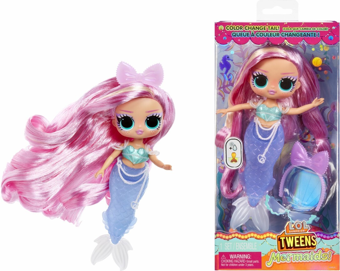 Neuer Charakter im Meerjungfrauenlook. Flosse mit Farbwechsel. Lange Haare zum Stylen. Hübsches Outfit mit passenden Accessoires. Inkl. zahlreichen Überraschungen. Ca. 17 cm. Ab 4 Jahren. Wir stellen vor: die L.O.L. Surprise! Tweens Meerjungfrauenpuppen! Entdecke die neue Tweens-Modepuppe im brandneuen Meerjungfrauen-Look, einschließlich wunderschöner farbwechselnder Meerjungfrauenflosse! Dies frechen Tween kommt mit vielen Überraschungen zum Thema Meerjungfrau, einschließlich Mode, Accessoires und mehr!