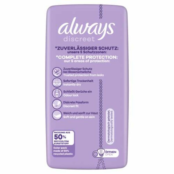 Die Always Discreet Inkontinenzeinlagen Small Plus bieten Ihnen Rundumschutz und eine diskrete Passform. Jede Einlage ist so konzipiert, dass sie zuverlässigen Schutz vor Auslaufen, Geruchskontrolle, sofortiges Trocknen und ein weiches, sanftes Gefühl auf der Haut bietet, während sie sich diskret an Ihren Körper anpasst. Wenn Niesen oder Lachen zu Blasenschwäche führt, bieten die Always Discreet Einlagen Small einen zuverlässigen Schutz und die gewünschte Diskretion, damit Sie sich sicher fühlen können.