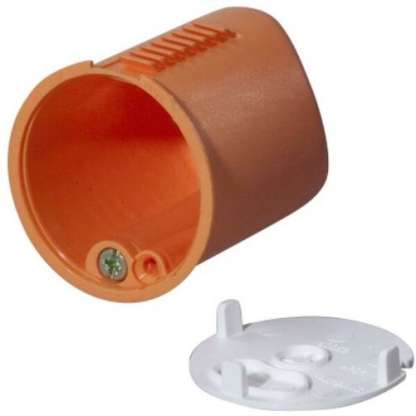 Hohlwand Auslassdose, flammidrig, Ausführung mit Metallkralle, Ausbrechöffnungen für Rohre und Leitungen, Schutzart IP30, VDE geprüft, Bohrloch Ø 35 mm, orange, Tiefe 45 mm, inkl. Schraubdeckel