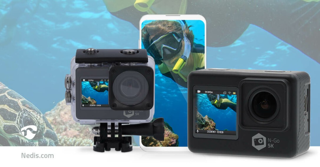 Nedis Action Cam / Dualer Bildschirm / 5K@30fps / 16 MPixel / Wasserdicht bis: 30.0 m / 80 min / Wi-Fi / App erhältlich für: Android™ / IOS / Inkl. halterung / Schwarz
