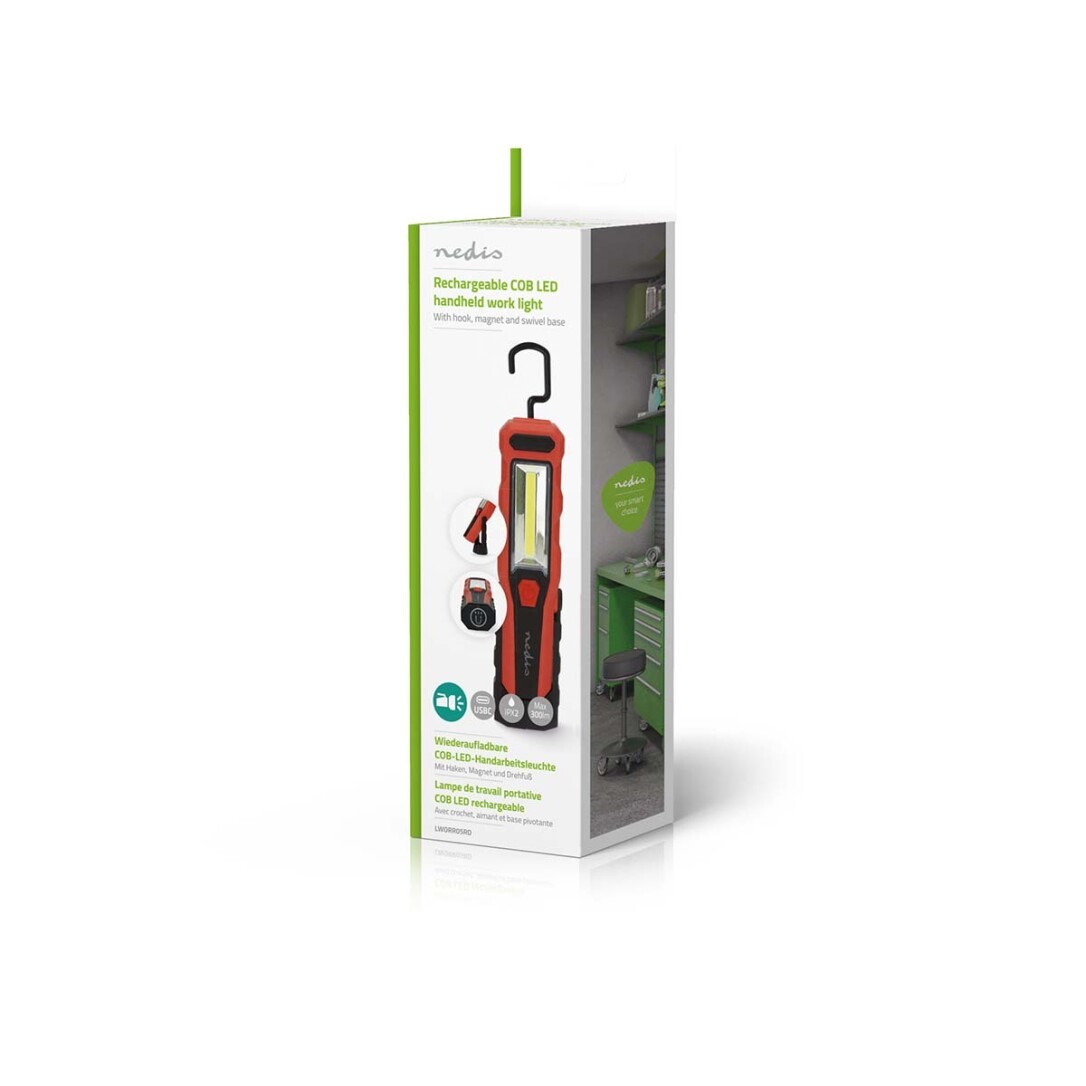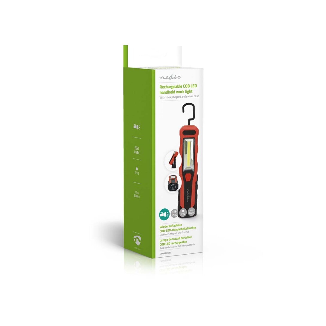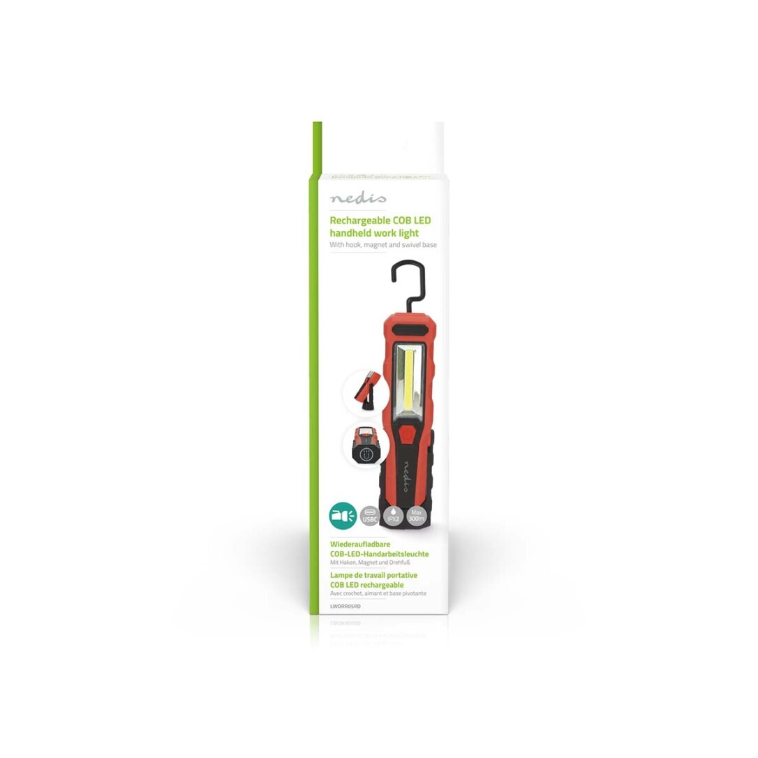 Die kompakte, wiederaufladbare und robuste LED-Handleuchte von Nedis eignet sich hervorragend als handliche und kompakte Lichtquelle für Arbeiten im Haushalt, in der Werkstatt oder auch für Reparaturarbeiten im Automotive-Bereich. Der drehbare Fuß, der 360°-Drehhaken und der integrierte Magnet sorgen für eine freihändige Bedienung und passen sich jeder Situation an.Ausgestattet mit einer 3-Watt-COB-LED mit Spot- und Flutlichteinstellungen sowie einer 1-Watt-LED auf der Oberseite bietet diese Leuchte eine einstellbare Helligkeit, die auf Ihre Bedürfnisse zugeschnitten ist. Mit einer beachtlichen Abstrahlweite von bis zu 20 Metern und 300 Lumen leuchtet sie selbst die dunkelsten Ecken aus.Der integrierte Li-Ionen-Akku bietet eine Brenndauer von bis zu 6 Stunden und sorgt so für eine lange Funktionsfähigkeit. Das mühelose Aufladen erfolgt über den USB-C-Ladeanschluss, der eine unterbrechungsfreie Beleuchtung garantiert, wann immer Sie sie benötigen.