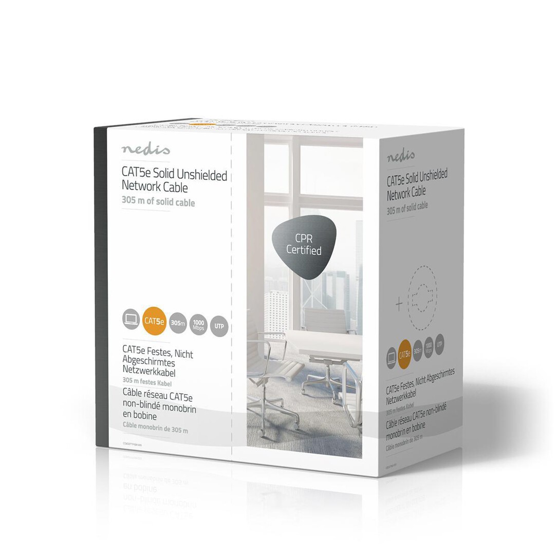 Nedis CAT5e Netzwerkkabel Rolle / Solid / U/UTP / Kupfer / 305 m / Innen / Rund / PVC / Grau / Pull Box - ausziehbar