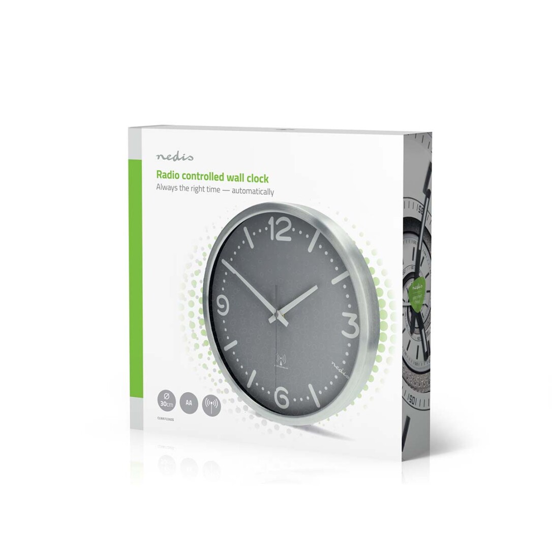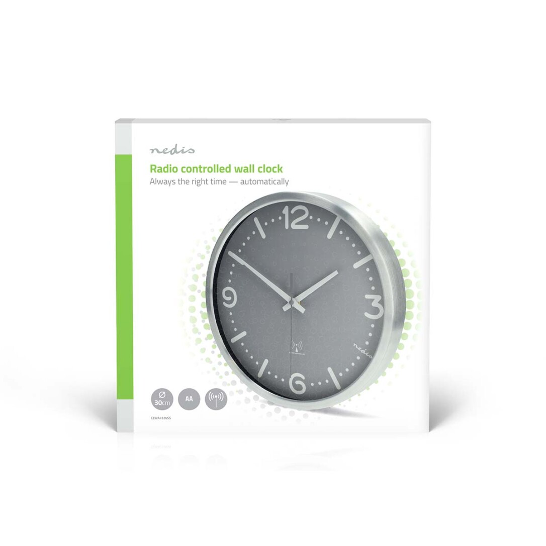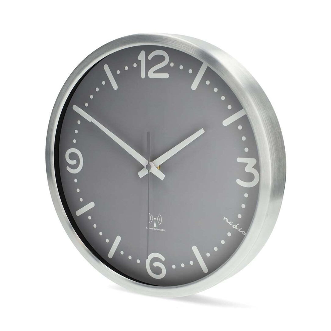 Nedis Wanduhr / Durchmesser: 300 mm / Aluminium / Funkgesteuerte Zeit / Leise Bewegung / Grau / Metall