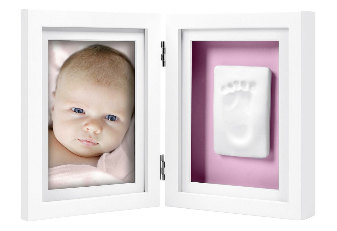 Der Holzrahmen und die beiden Passepartouts sind in edlem Weiß gehalten. Inhalt: 1 x Bilderrahmen zum Aufstellen, 1 x Modelliermasse, 1 x blauer Hintergrund, 1 x rosa Hintergrund, 1 x Ausroller, 1 x Lineal, (BxHxT): ca. 29,8x19,2x3,5 cm, Fotoöffnung 10x15 cm. Die Abdruckmasse ist bereits fertig gemischt und nachdem sie aus der Verpackung genommen wurde einsatzbereit. Ausrollen und Baby's Hand oder Fuß leicht hineindrücken. Danach einfach aushärten lassen.