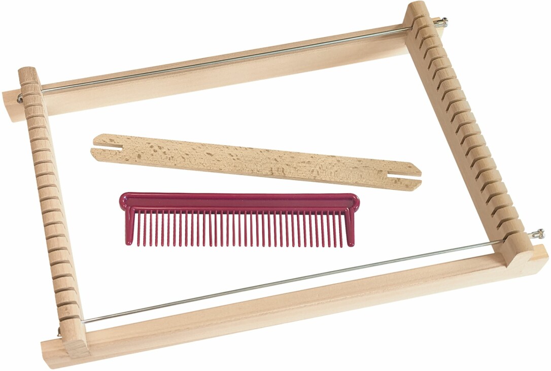 Webrahmen aus Lindenholz im Beutel , 17 mm Durchmesser mit 1 Schiffchen, Kamm und 2 Metallstäbe.