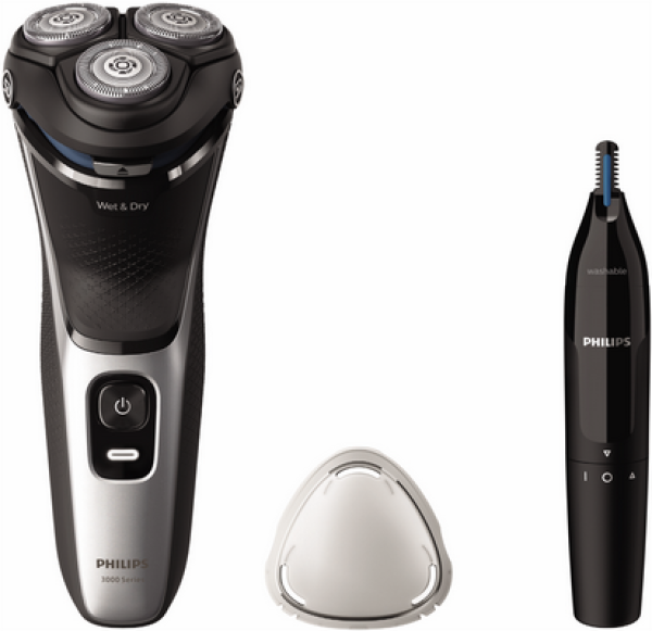 Philips Shaver 3000 Series S3143/02 Elektrischer Nass- und Trockenrasierer. Rasierapparatsystem: Rotationstrasierer, Produktfarbe: Schwarz, Silber, Rasiersystemtechnologien: PowerCut blade system. Energiequelle: Akku, Akku-/Batterietechnologie: Lithium-Ion (Li-Ion), Akku-/Batterietyp: Integrierte Batterie. Breite: 140 mm, Tiefe: 80 mm, Höhe: 190 mm. Paketgewicht: 572 g, Verpackungsart: Box. Menge pro Packung: 1 Stück(e), Zusatzkämme: Ohr, Nase
