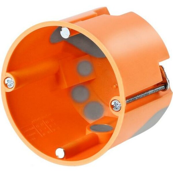 Hohlwand Geräteverbindungsdosedose mit Durchstoßmembran, winddicht, flammidrig, Ausführung mit Metallkralle, mit vermontierten Geräteschrauben, Geräteschraubenabstand 60 mm, Schutzart IP30, VDE geprüft, Bohrloch Ø 68 mm, orange, Tiefe 61 mm