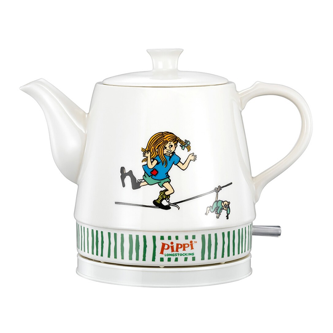 Der weiße kabellose Wasserkocher Pippi ist aus Keramik gefertigt und hat ein Motiv, das nostalgische Gedanken auslöst.Pippi ist nicht wie alle anderen.
