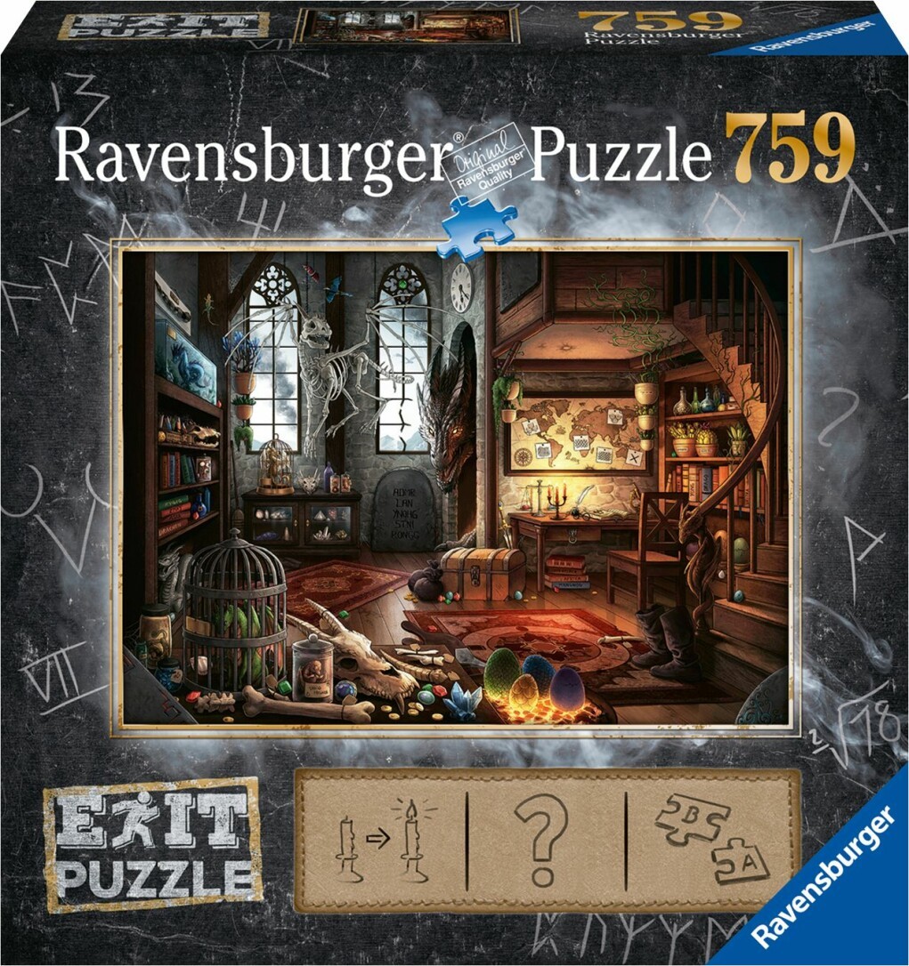 EXIT Puzzle von Ravensburger! Puzzeln, Rätseln, Lösen. Gelingt es, die Puzzleteile an ihren Platz zu legen, die Rätsel zu finden und sie mit zu knacken? Verschiedene Schwierigkeitslevel der Puzzles sowie zwei unterschiedliche Teilezahlen innerhalb der EXIT Reihe garantieren abwechslungsreiches Puzzle- und Rätselvergnügen! In der Schachtel befindet sich ein Puzzle mit 759 geheimnisvollen Teilen, eine Anleitung und einen Umschlag welcher die Lösung beinhaltet.Jetzt gibt es das Konzept der EXIT Rooms auch als Ravensburger Puzzle! Frei nach dem Motto: Puzzeln, Rätseln, Lösen. Gelingt es, die vielen Puzzleteile an ihren Platz zu legen, alle Rätsel zu finden und sie mit hinreichender Kombinationsgabe zu knacken? Eine spannende Geschichte lässt Puzzler und Spieler in die geheimnisumwobene Welt des EXIT Puzzles eintauchen, in der es den EXIT zu finden gilt! Gelingt dies, kann man mit Stolz behaupten seine Mission mit Bravour gemeistert zu haben. Verschiedene Schwierigkeitslevel der Puzzles sowie zwei unterschiedliche Teilezahlen innerhalb der EXIT Reihe Puzzles garantieren dabei abwechslungsreiches Puzzle- und Rätselvergnügen! In der Schachtel befindet sich ein Puzzle mit 759 geheimnisvollen Teilen, eine Anleitung mit einer mysteriösen Geschichte und einen Umschlag welcher die Lösung beinhaltet.