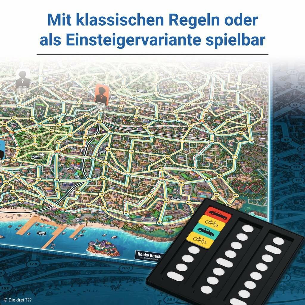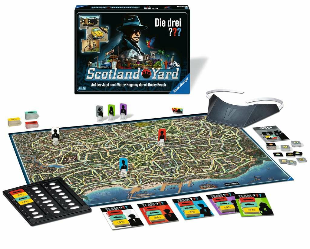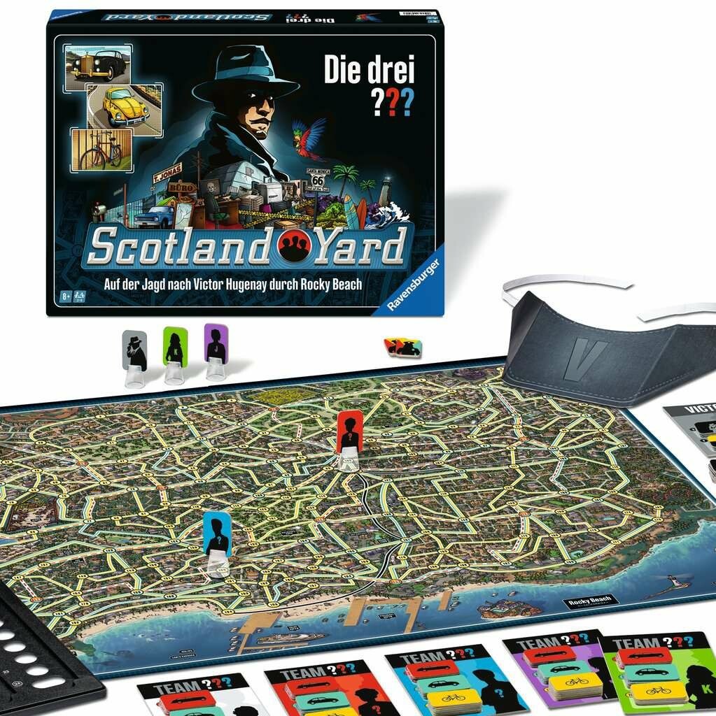 Der Spieleklassiker Scotland Yard trifft auf die Kult-Detektive Justus Jonas, Peter Shaw und Bob Andrews. Zusammen sind sie Die drei ??? und übernehmen jeden Fall. Am Tatort Rocky Beach jagen die drei ??? den Ganoven Victor Hugenay. Die Verfolgungsjagd führt durch die ganze Stadt und die Detektive müssen gut zusammenarbeiten, um ihn zu finden. Eine spannende Verfolgungsjagd auf dem Spielplan beginnt! Garantierte Spannung mit dem Familienspiel für 2-6 Personen ab 8 Jahren.
