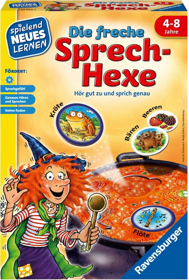 In dem Kinderspiel Die freche Sprech-Hexe stellen sich Fragen wie: Was reimt sich auf Haus? Was klingt ähnlich wie Kröte? 2-4 Kinder müssen Zaubertrank-Zutaten finden, die sich reimen. Wer genau hinhört und richtig spricht, findet das passende Kartenpaar. Mit der roten Scheibe können die Kinder prüfen, ob sie alles richtig gemacht haben und dürfen zur Belohnung die Zutaten in den magischen Zaubertrank einrühren.Das Brettspiel von 4-8 Jahren fördert das Sprachgefühl, genaues Hören und deutliches Sprechen - wichtige Grundsteine für das spätere Lesenlerenen und Schreiben. Abwechslung zur Reimpaar-Hexerei bietet die Variante mit ähnlich klin-genden Wörtern (wie Bären-Beeren) und ein Merkspiel zu Anlauten. Lernspiele, die richtig Spaß machen: So heißt das Motto der Lernspielreihe von Ravensburger, mit der Kinder in den lernintensivsten Jahren in ihrer Entwicklung unterstützt werden. Die Lernstoffe sind in spannenden Geschichten verpackt, eine Vielfalt an Materialien und Methoden erlaubt das Lernen mit allen Sinnen.