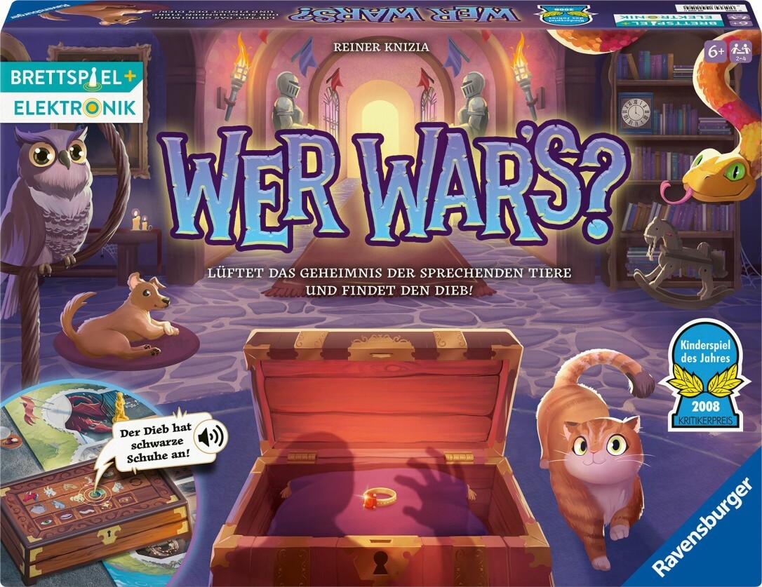 In diesem Brettspiel mit Elektronik möchten die Kinder den Dieb des Zauberrings herausfinden, um das Königreich zu retten. Dafür müssen sie gemeinsam mit den Tieren im Schloss sprechen und ihnen ihr gewünschtes Futter bringen, denn die Tiere liefern Hinweise, wer den Ring gestohlen hat. Nur einer der Personen im Schloss war's! Nur wer genau? Die Elektronik der Schatztruhe steuert den Spielablauf von ''Wer wars? und sorgt dafür, dass jedes Spiel anders verläuft und damit aufs Neue spannend ist.Findet den Dieb des Zauberrings! Wer wars? Welcher Person im Schloss hat ihn gestohlen? Die sprechenden Tiere werden den Kindern sicher helfen. Dafür möchten sie ihr gewünschtes Futter bekommen. Pfau, Esel, Ziege und Co. haben nämlich den Dieb in der Nacht beobachtet. Nur gemeinsam entlocken die Detektive den sprechenden Tieren ihre geheimen Hinweise auf den Täter. Immer wieder können Verdächtige nach und nach ausgeschlossen werden und schon bald sind die Kinder dem Dieb auf der Spur. Aber Achtung! Die Zeit drängt. Der Dieb muss vor Ablauf der Zeit identifiziert sein. Aber das schaffen die Kinder sicher, schließlich geht es darum, das Königreich zu retten! Die intelligente Elektronik der Schatztruhe steuert den Spielablauf und sorgt dafür, dass jedes Spiel anders verläuft und damit aufs Neue spannend ist. Der Spieleklassiker hat nun eine überarbeitete Grafik und ein modernes Design.