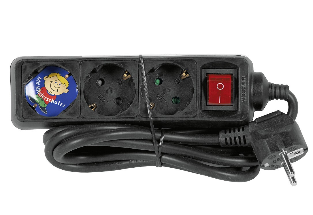 3 quersitzende Steckdosentöpfe, komfortabler Einsatz von Winkelsteckern möglich, mit beleuchtetem Kontrollschalter, bruchfestes Gehäuse aus Spezialkunststoff, ergonomisch gestalteter Schutzkontaktstecker, 2-polig mit Schutzkontakt, Zuleitung 1,4 m H05VV-F 3G1,5, Winkelstecker, technische Daten: 16 A, 250 V~, 3500 Watt, Abmessungen (B x H x T): 200 x 53 x 40 mm, VDE- und GS-Prüfzeichen