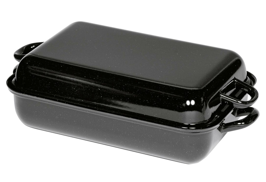 RIESS Bratrohrpfanne "Classic", mit Deckel 32/22, H 13,1 cm, Profi, Schwarzemaille, mit zwei emaillierten Griffen für einfaches Hantieren, gut schließender Deckel mit Griff, der ebenfalls als Bratform dienen kann, Innenmaße 31 × 21 cm, Außenmaße 38,5 × 21,8 cm (mit Griff), schnitt- und kratzfest, für energiesparendes Kochen, backofengeeignet, hitzebeständig bis 450°C – maximal empfohlene Betriebstemperatur bei 220°