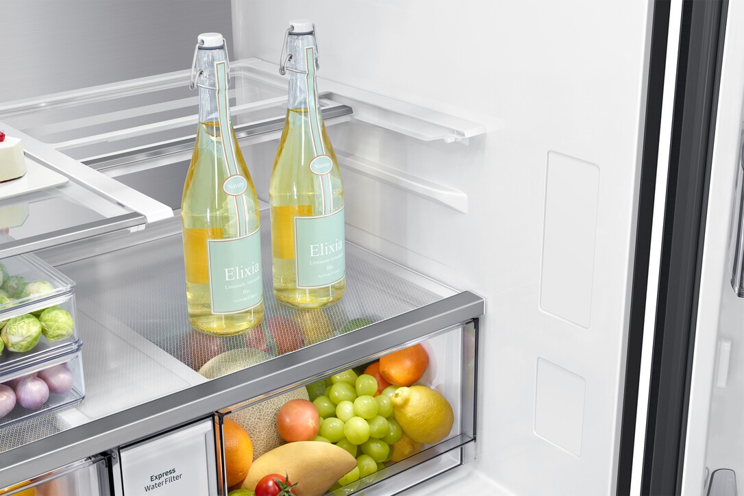AI Vision Inside, Freue dich auf eine smarte Art, deine Lebensmittel zu verwalten. Mithilfe einer internen Kamera kann AI Vision Inside bestimmte frische Lebensmittel beim Einlegen oder Herausnehmen erkennen und ermöglicht dir die Verwaltung deiner persönlichen Lebensmittelliste. So kannst du mithilfe der SmartThings-App zum Beispiel vom Supermarkt aus sehen, was sich noch im Kühlschrank befindet oder Fotos der Türfächer prüfen. Zudem wird deine Menü-Planung erleichtert, indem du Rezeptvorschläge erhältst basierend auf den Lebensmitteln in deinem Kühlschrank oder Du erhältst Infos zu Verfallsdaten.Innenliegendes Beverage Center mit Dual Water Dispenser. Genieße schnellen und einfachen Zugang zu erfrischendem und aromatisiertem Wasser. Der Dual Water Dispenser bildet den Kern des Beverage Centers. Hier kann gefiltertes, gekühltes Wasser genossen werden - sowohl auf Knopfdruck als auch im sich automatisch auffüllenden Pitcher. Der Pitcher ist griffbereit, spülmaschinenfest und BPA-frei* und verfügt über einen Aroma-Infuser. Mit diesem kann mühelos gefiltertes Wasser mit frischem Obst und Gemüse hergestellt werden.