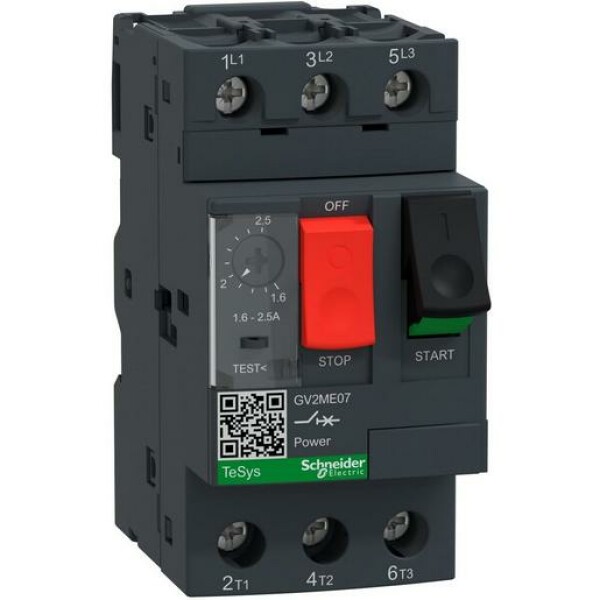 TeSys Motorschutzschalter GV2ME. Motorschutzschalter, 3P, Tasterbetätigung, Schraubanschluss. Bemessungsleistung 0,75 kW, Einstellbereich 1,6-2,5 A. Mit thermischen und magnetischen Auslösern. In der Grundausführung plombierbar und abschließbar. Betätigung über Taster, Schraubklemmen. Bemessungsspannung 400 V, nach AC-3.