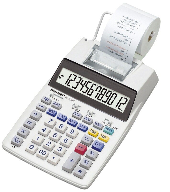 Sharp EL-1750V. Stellen: 12 Ziffern. Drucktyp: Carbonband, Druckgeschwindigkeit: 2 lpm. Steuerberechnung. Energiequelle: Wechselstrom/Batterie