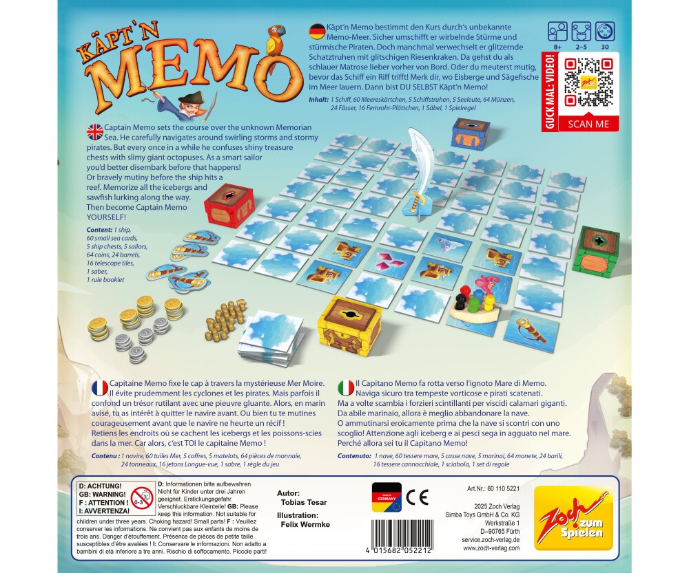 Mit der Kraft der eigenen Erinnerung trotzen 2-5 Seeleute allen Gefahren und heben wertvolle Schätze aus den Tiefen des Memorischen Meers. Für 2-5 Spieler ab 8 Jahren. Sprachen: D,GB,F,I