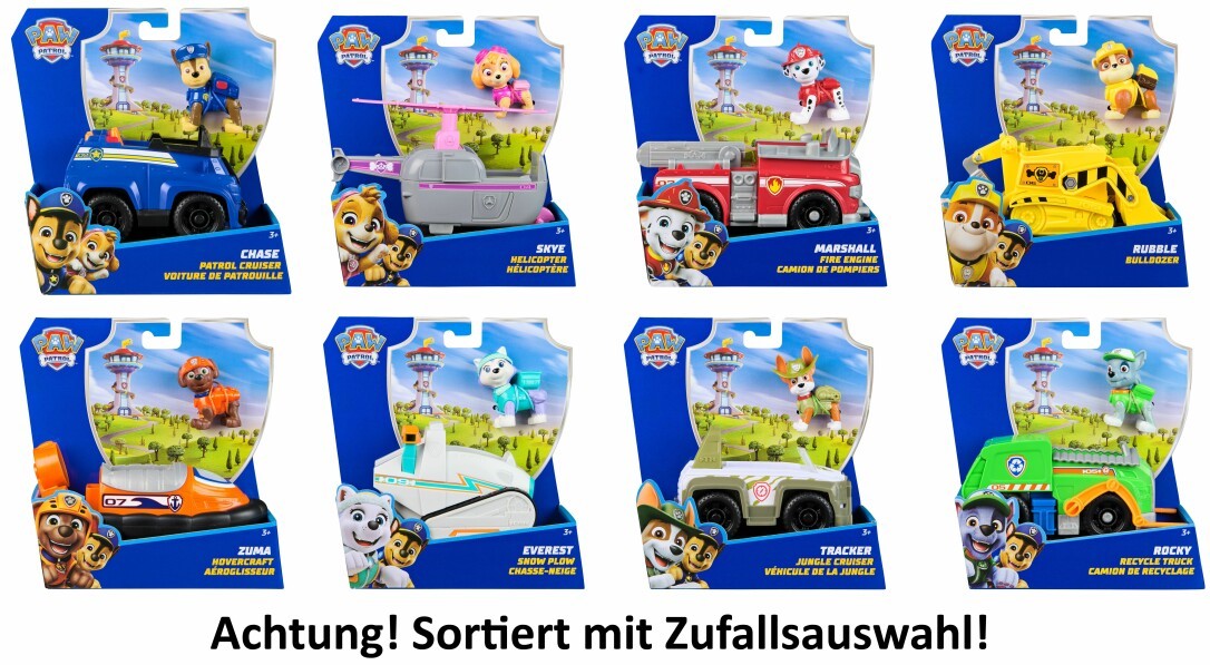 Die mutigen Helden der PAW Patrol aus der gleichnamigen TV-Serie sind mit ihren Fahrzeugen stets zur Stelle, wenn Ryder sie zum Einsatz in Adventure Bay ruft. Mit freidrehenden Rädern und spannenden individuellen Funktionen bringt jedes Fahrzeug Action ins Kinderzimmer. Bei jedem Fahrzeug ist die passende Welpenfigur im Standard-Maßstab der Hero Pups (ca. 7 cm groß) gleich mit dabei. Die Figuren lassen sich im Fahrzeug befestigen. Für mehr Nachhaltigkeit bestehen alle Fahrzeuge und Spielfiguren aus dieser Serie zum Großteil aus recyceltem Kunststoff. Da Fahrzeug und Spielfigur im Standard-Maßstab gehalten sind, passen sie zu vielen weiteren Spielsets der PAW Patrol Spielzeuglinie. Chase, Skye, Marshall, Rubble, Zuma, Everest, Tracker und Rocky mit ihren Fahrzeugen sind einzeln erhältlich. Im Lieferumfang enthalten ist ein Fahrzeug mit Figur, welcher Charakter geliefert wird unterliegt einer Zufallsauswahl. Für diese Fellnasen ist kein Einsatz zu groß und keine Pfote zu klein. Geeignet für Kinder ab 3 Jahren.