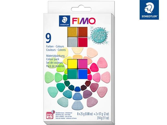 Modelliermasse Set Modelliermasse Fimo effect pearls MP, FIMO® leather-effect Ofenhärtende Modelliermasse. Verschiedene Materialpackungen mit unterschiedlichen Farbeffekten und aufeinander abgestimmten Farbkombinationen, Effektvolle Ergänzung zu FIMO ofenhärtenden Modelliermassen, Passende Härteeinstellung für den jeweiligen Effekt, Kompatibel mit FIMO soft und FIMO professional. Ausführung Modelliermasse: Werkstoff: Kunststoff, Farbe: sortiert. Art des Trocknungsverfahrens: Ofenhärtend. Größe (B x T x H): 118 mm x 17 mm x 215 mm. Ausführung des Inhalts mit Packung: Inh:8 Halbblöcke à 25 g (metallic gold, metallic kupfer,metallic silber, kirschrot, limone, himbeer, smaragd,brillantblau), 2 x Standardblock à 57 g (metallic perlmut), 1 x Farbmischprospekt,Gebrauchsanleitung