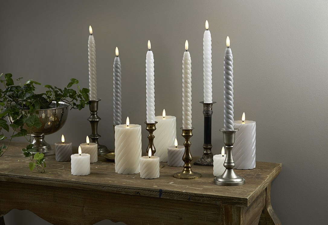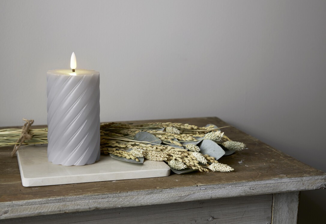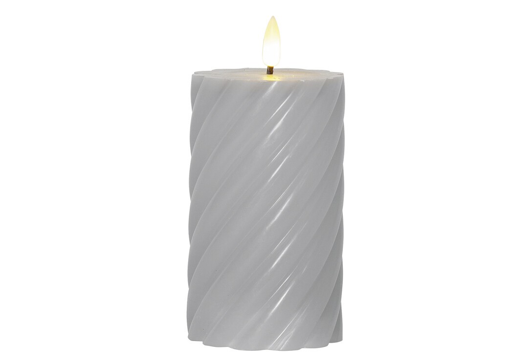 Graue Kerze mit gedrehtem Wachs. Die naturgetreue Flamme leuchtet mit einem warmen weißen Schein. Mit eingebautem Timer (6 Std. an, 18 Std. aus). Gesamthöhe einschließlich Flamme 15 cm. Batteriebetrieben. 2 Batterien AA nicht enthalten.