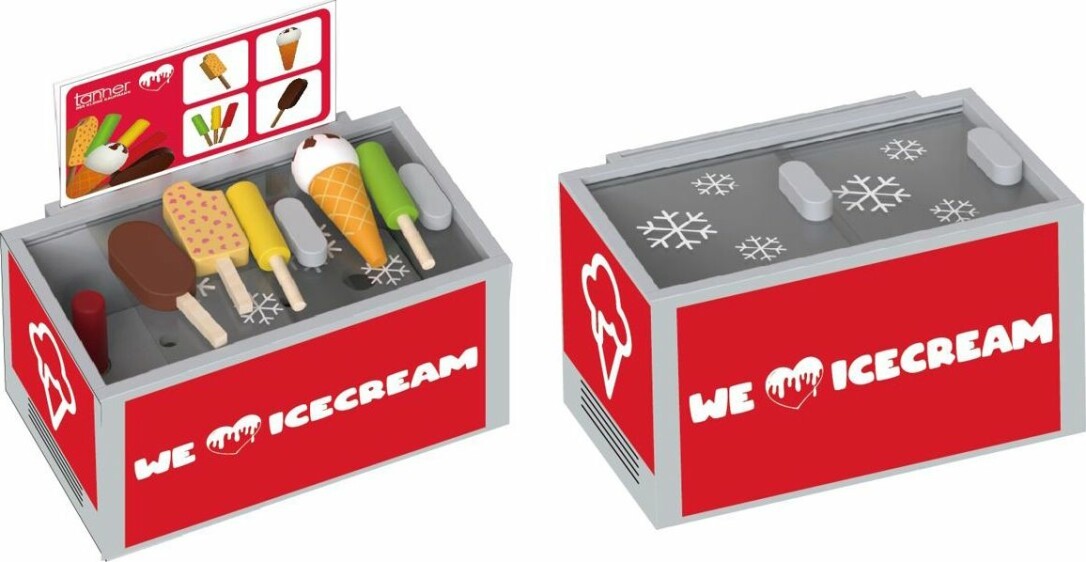 Es ist Sommer und es ist heiß - wir wollen Eis! Kühle Leckereien können Kinder ab 3 Jahren mit der zauberhaften Holzeistruhe servieren. Das Kinderspielzeug ist robust aus Holz verarbeitet. Die Truhe ist mit vier verschiedenen Eissorten gefüllt und kann ganz leicht an den beiden angebrachten Griffen auf und zu geschoben werden. Außerdem mit dabei ist eine Eistafel zum Abnehmen.