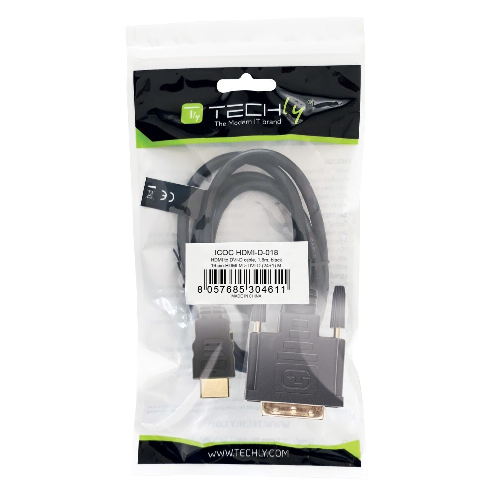 Techly 1.8m HDMI - DVI-D M/M. Kabellänge: 1,8 m, Anschluss 1: HDMI, Anschluss 2: DVI-D. Konformitätsbescheinigungen: CE, RoHS, Zertifizierung: CE, UL, RoHS. Gewicht: 126 g. Verpackungsart: Polybag. Menge pro Packung: 1 Stück(e)